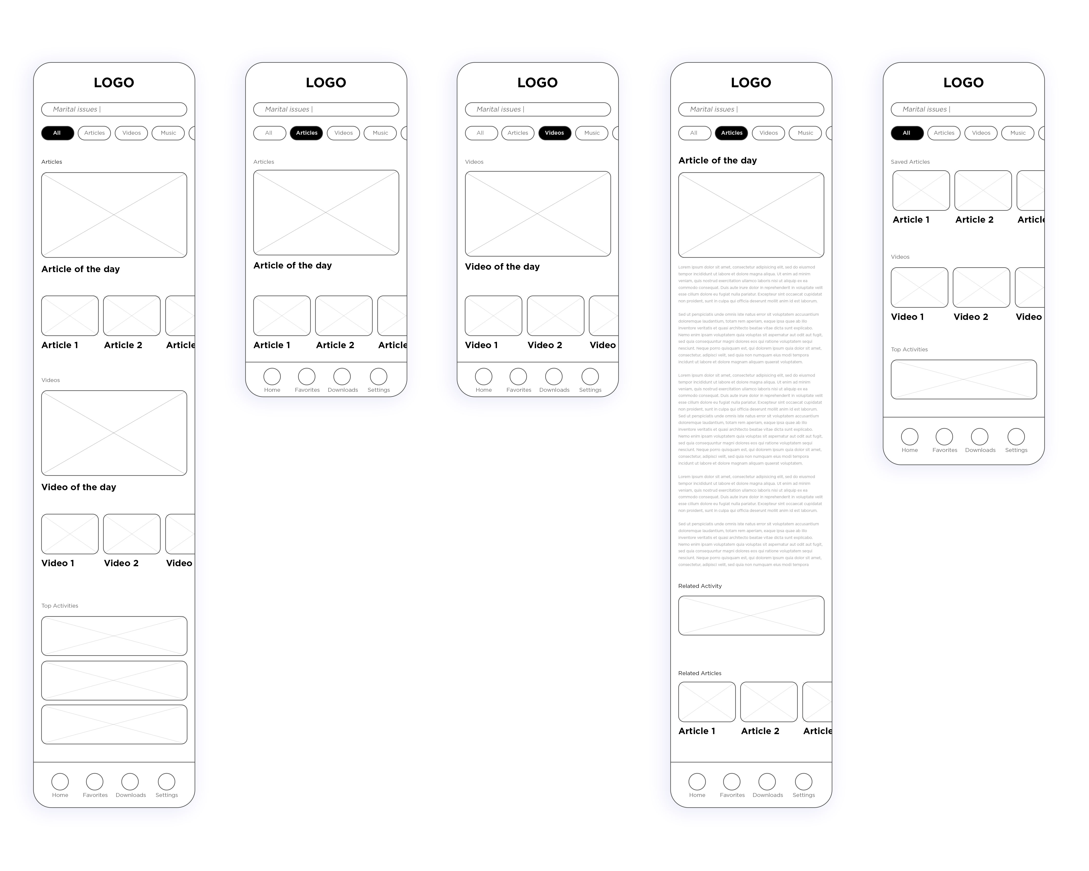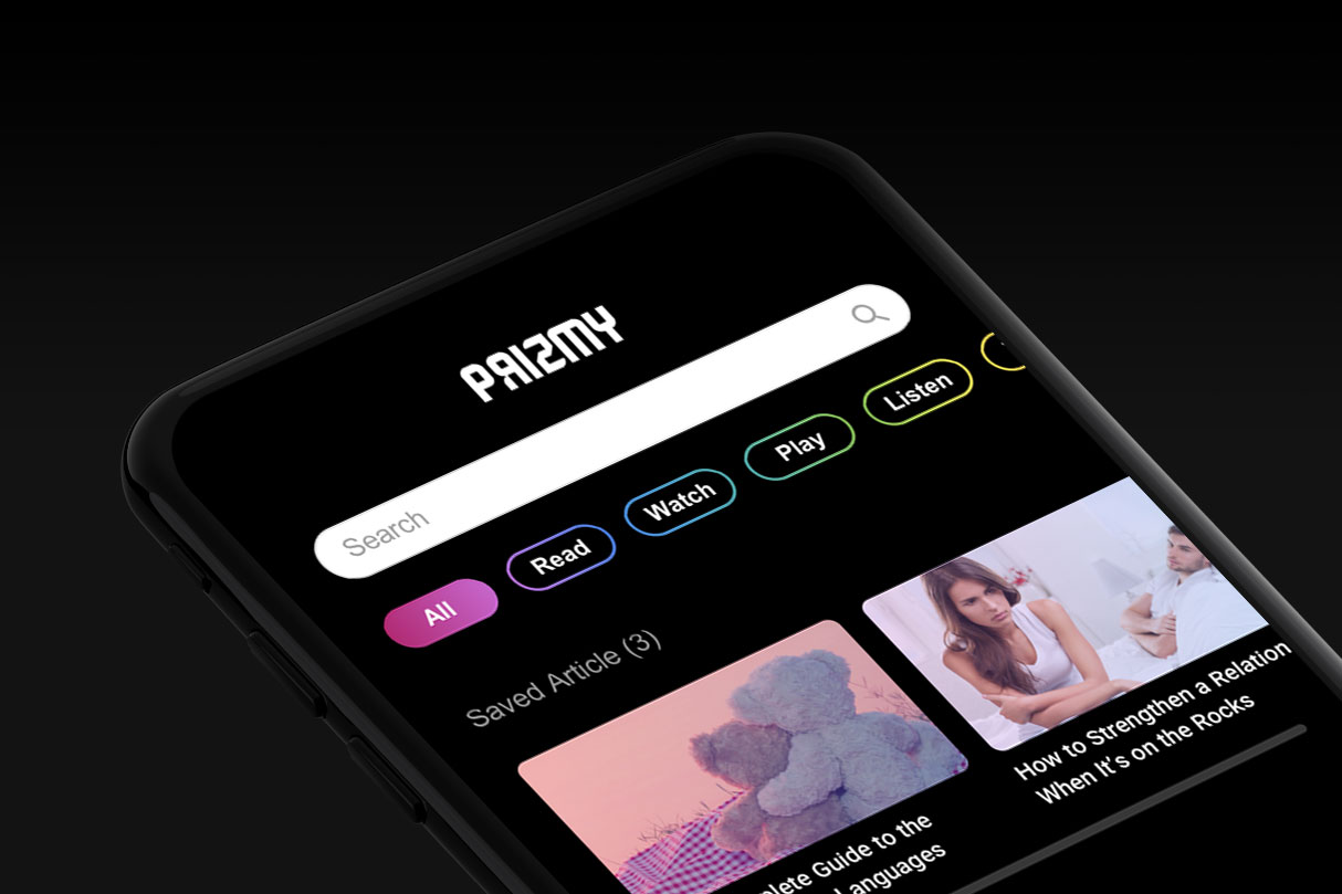 After series of iterations we were able to distill the concept down to the core flow which focuses on the catered content depending on the search criteria. The content is grouped per category: reading, watching, listening etc.