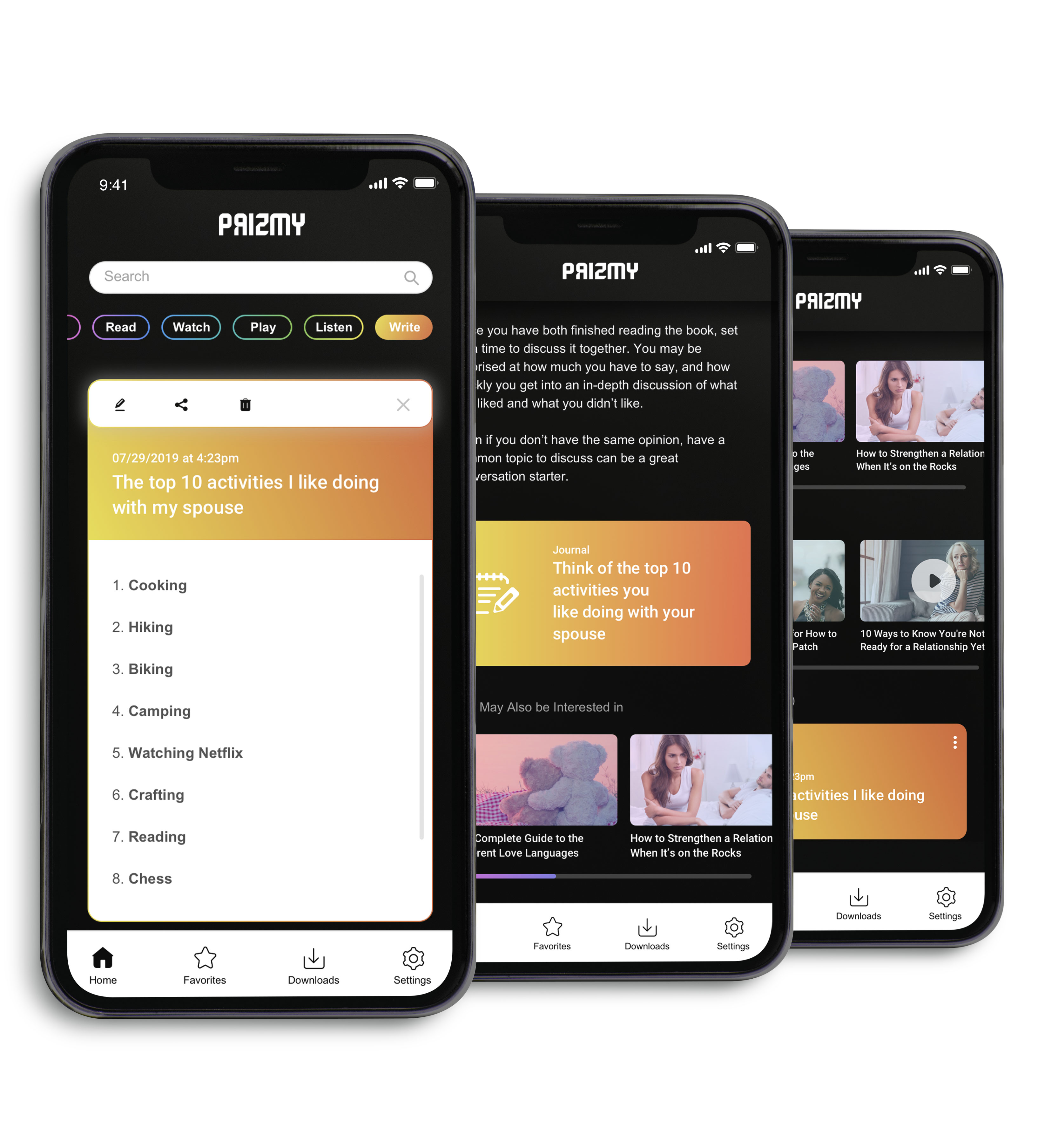 After reading an article on the top 10 activities that help couples bond, the user is prompted to journal about the 10 activities s/he likes doing with his/her partner.