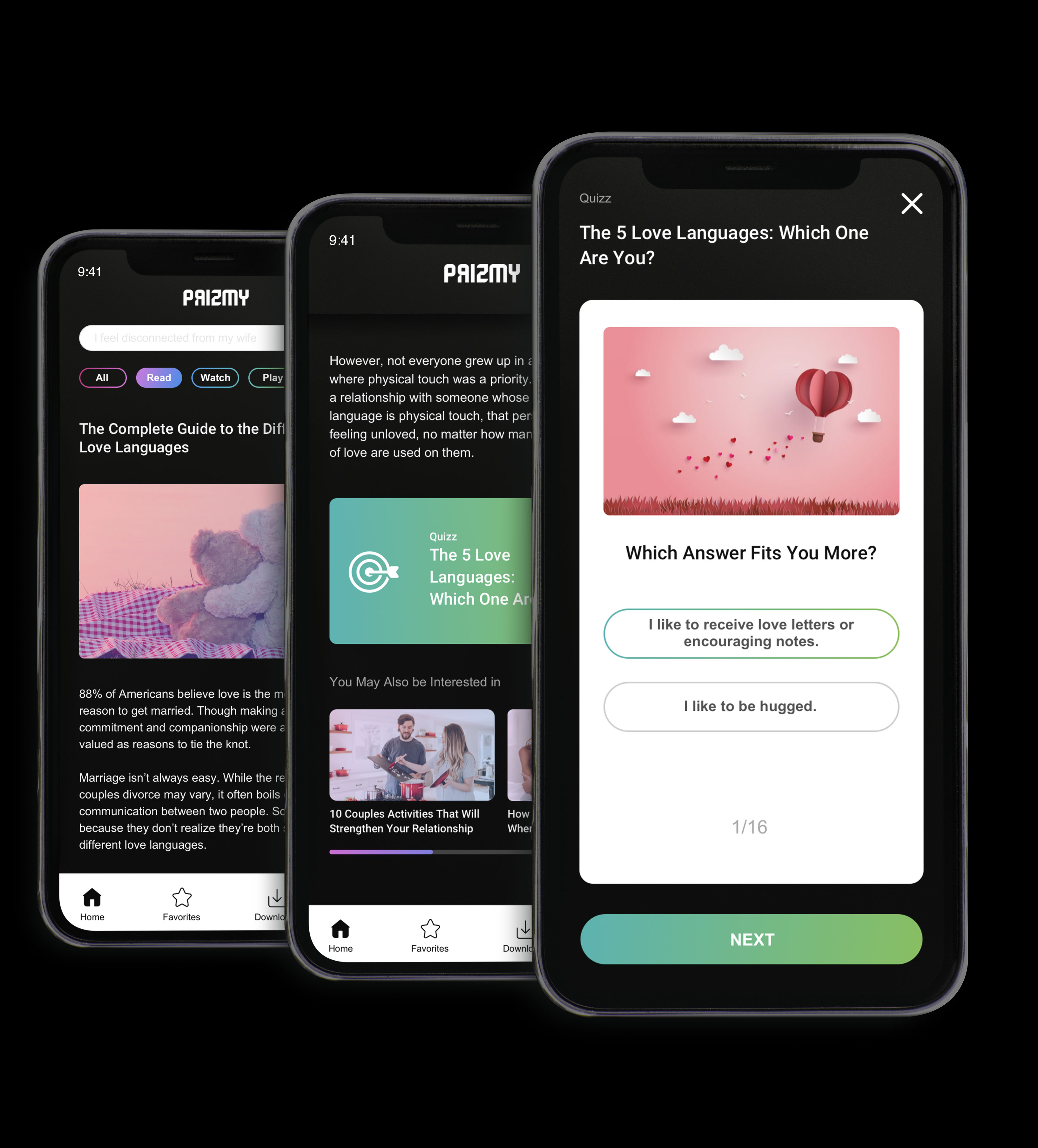 After reading an article, the user is offered a respective activity relevant to the article’s subject. In this case the user reads an article on love languages and in the end gets to take a test to identify their own love language.